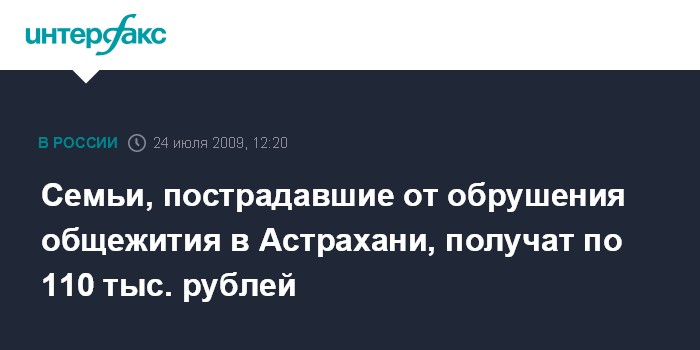 Москва. 24 июля. INTERFAX.RU - В Астрахани 24 семьям, проживавшим в общежитии по ул. Савушкина, обрушившемся в среду, выделена материальная помощь.