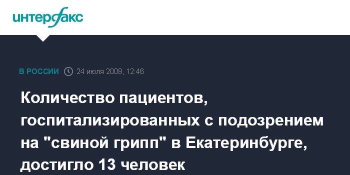 Москва. 24 июля. INTERFAX.RU - Число жителей Екатеринбурга, госпитализированных в ГКБ N40 с подозрением на "свиной грипп", достигло 13 человек.