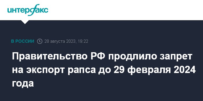 Москва. 28 августа. INTERFAX.RU - Правительство РФ приняло постановление о запрете с 1 сентября 2023 года по 29 февраля 2024 года экспорта рапса из России.