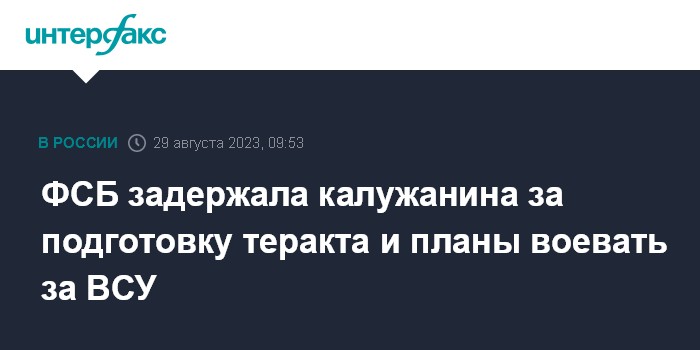 Москва. 29 августа. INTERFAX.RU - ФСБ сообщила о задержании жителя Калужской области, собиравшегося принять участие в боевых действиях на стороне Украины и готовившего теракт в регионе.