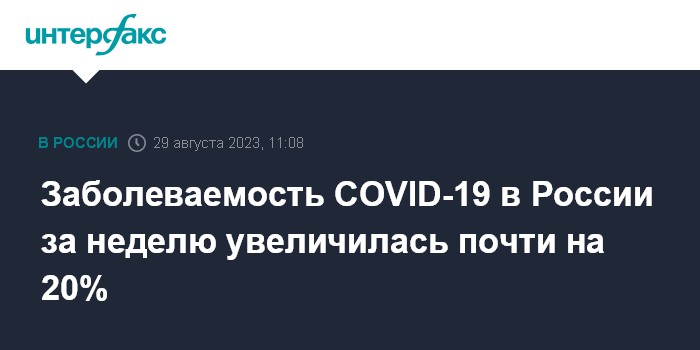 Москва. 29 августа. INTERFAX.RU - Показатель заболеваемости коронавирусом в РФ за неделю с 21 по 27 августа увеличился по сравнению с предыдущей неделей на 19,6%, сообщили во вторник в оперативном штабе по борьбе с коронавирусной инфекцией.
