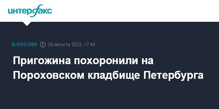 Москва. 29 августа. INTERFAX.RU - Бизнесмен Евгений Пригожин похоронен во вторник на Пороховском кладбище Санкт-Петербурга, сообщили "Интерфаксу" в пресс-службе предпринимателя.