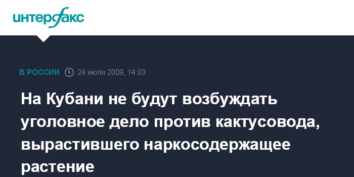 Москва. 24 июля. INTERFAX.RU - Кубанские наркополицейские не будут преследовать известного местного кактусовода Сергея Калмыкова за культивирование запрещенного кактуса, однако попросили больше не выращивать подобные растения. Как пояснили агентству "Интерфакс-Юг" в УФСКН по Краснодарскому краю, по результатам проверки принято решение уголовное дело в отношении кактусовода не возбуждать.