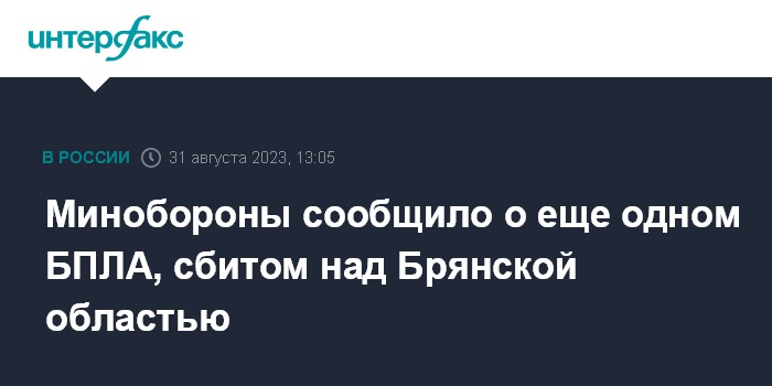 Москва. 31 августа. INTERFAX.RU - Российские силы ПВО сбили над Брянской областью еще один украинский беспилотник , сообщило Минобороны. Это произошло 31 августа около полудня.