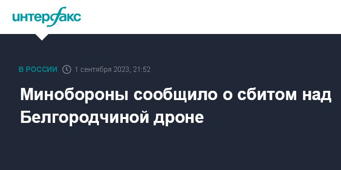 "1 сентября около 21.15 по Москве российскими средствами ПВО была пресечена попытка киевского режима совершить террористическую атаку беспилотным летательным аппаратом самолетного типа по территории Российской Федерации, - говорится в сообщении. - Дежурными средствами ПВО украинский БПЛА был уничтожен в воздухе над территорией Белгородской области".