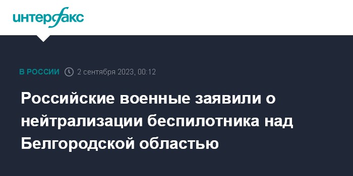 Москва. 2 сентября. INTERFAX.RU - Российские военные сообщили, что нейтрализовали еще один украинский беспилотник над Белгородской областью.