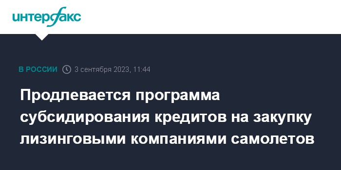 Москва. 3 сентября. INTERFAX.RU - Действующая программа субсидирования процентных ставок по кредитам, которые лизинговые компании привлекают для закупки российских самолётов, будет распространена на займы, взятые в 2023 году, сообщается в воскресенье на сайте правительства России.