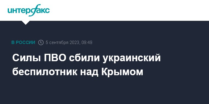 Москва. 5 сентября. INTERFAX.RU - Российские силы противовоздушной обороны (ПВО) уничтожили украинский беспилотник над Крымом, сообщили в Минобороны РФ.