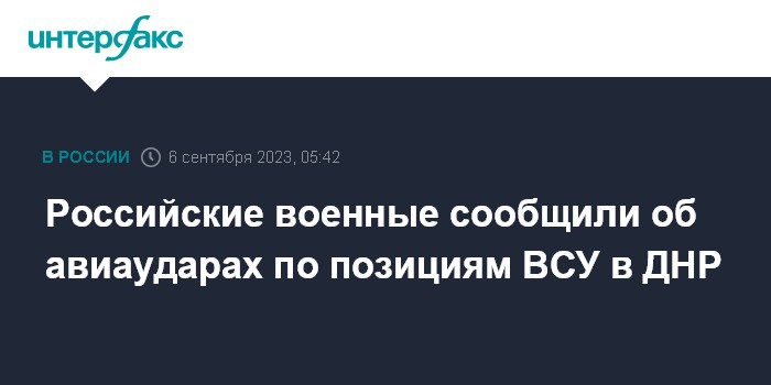 Москва. 6 сентября. INTERFAX.RU - Авиация российской группировки войск "Юг" нанесла удары по пунктам временной дислокации вооруженных сил Украины (ВСУ) в Донецкой народной республике (ДНР), сообщил начальник пресс-центра группировки Георгий Минесашвили.