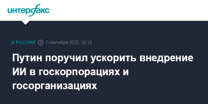 Москва. 7 сентября. INTERFAX.RU - Президент РФ Владимир Путин поручил правительству совместно с госкорпорациями и госорганизациями к 25 декабря внести корректировки в их стратегии цифровой трансформации с целью ускоренного внедрения в их деятельности технологий искусственного интеллекта (ИИ). Перечень поручений, утвержденных президентом РФ по итогам совещания с правительством от 19 июля, опубликован на сайте Кремля.