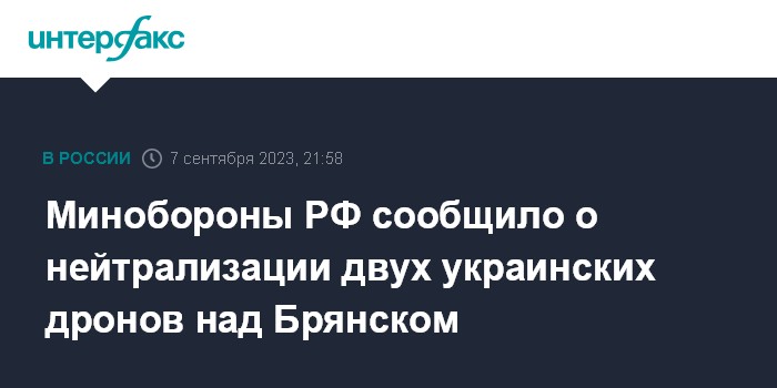 Москва. 7 сентября. INTERFAX.RU - Министерство обороны России заявило, что в четверг вечером над Брянском перехвачены два украинских беспилотника, один из них уничтожен в воздухе.