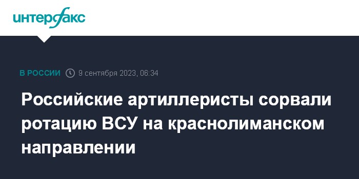 Москва. 9 сентября. INTERFAX.RU - Российские артиллеристы сорвали ротацию украинских войск на краснолиманском направлении, уничтожив резервные силы противника, сообщило Минобороны РФ.