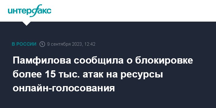 Москва. 9 сентября. INTERFAX.RU - Свыше 15 тыс. интернет-атак на ресурсы дистанционного электронного голосования (ДЭГ) на выборах заблокированы, сообщила в субботу глава ЦИК РФ Элла Памфилова.
