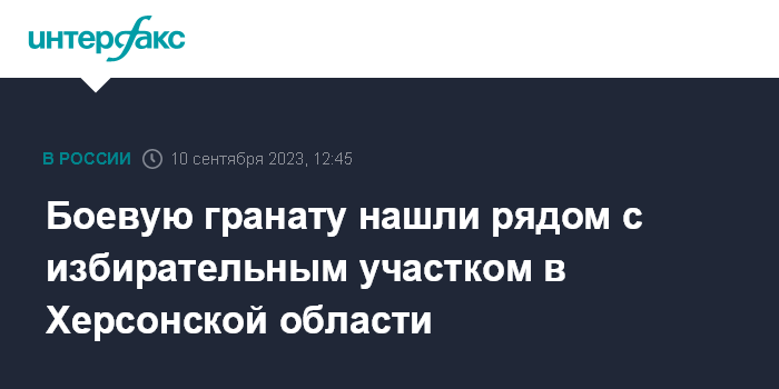 Москва. 10 сентября. INTERFAX.RU - Боевая граната была обнаружена рядом с избирательным участком в поселке Счастливцево на территории косы Арабатская стрелка в Херсонской области, сообщила в воскресенье журналистам председатель регионального избирком Марина Захарова.