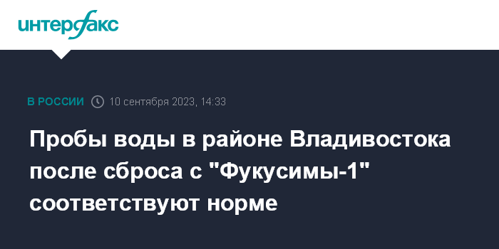 Москва. 10 сентября. INTERFAX.RU - Пробы морской воды, взятые в районе Владивостока в рамках проведения мониторинга содержания трития в воде после начала сброса очищенной воды с японской АЭС "Фукусима-1", соответствуют нормам, сообщили в воскресенье в Роспотребнадзоре.