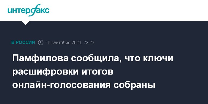 Москва. 10 сентября. INTERFAX.RU - Голосование на выборах во всех регионах завершено, прошла процедура сборки всех пяти ключей для расшифровки итогов дистанционного электронного голосования (ДЭГ), сообщила глава ЦИК РФ Элла Памфилова.