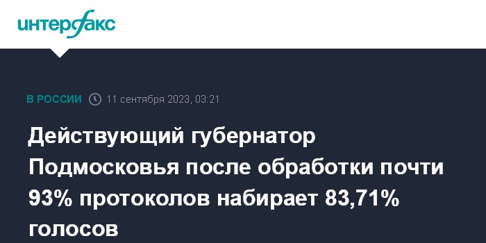 Действующий губернатор Подмосковья после обработки почти 93% протоколов набирает 83,71% голосов