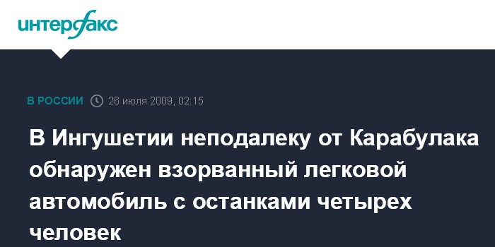 "Примерно в 10-15 километрах от Карабулака на автотрассе обнаружен разорвавшийся автомобиль "ВАЗ-2107" с останками четырех человек. Также в нем находилось оружие", - сообщил агентству "Интерфакс-Юг" в воскресенье источник в РОВД Карабулака.