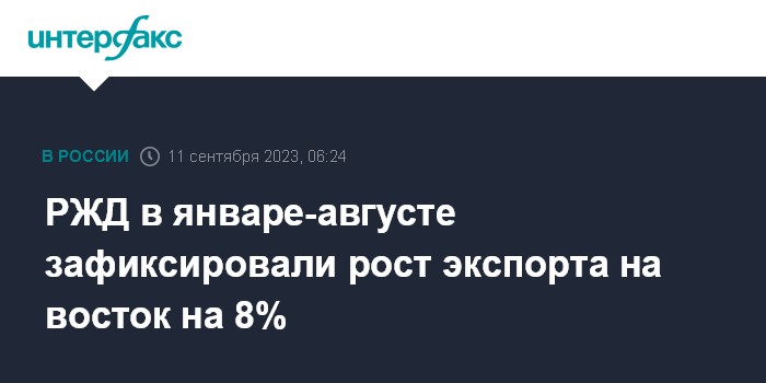 Москва. 11 сентября. INTERFAX.RU - ОАО "РЖД" в январе-августе 2023 года зафиксировало рост экспортных перевозок в восточном направлении по сравнению с аналогичным периодом прошлого года.