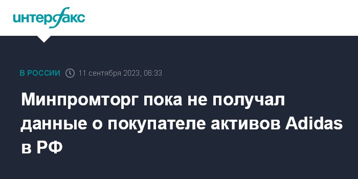 Москва. 11 сентября. INTERFAX.RU - Минпромторг РФ пока не получал от немецкого производителя спортивной одежды, обуви и аксессуаров Adidas информацию о возможном покупателе активов компании в РФ и по-прежнему выступает против продажи отдельных магазинов: бизнес должен быть продан целиком с дисконтом к рыночной цене, заявил журналистам замглавы Минпромторга Виктор Евтухов в кулуарах Восточного экономического форума.