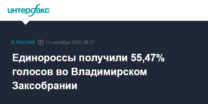 Москва. 11 сентября. INTERFAX.RU - На выборах в Законодательное собрание Владимирской области "Единая Россия" набрала 55,47% голосов по результатам обработки 100% протоколов, следует из данных Центризбиркома.