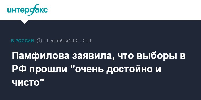 Москва. 11 сентября. INTERFAX.RU - Глава Центризбиркома Элла Памфилова охарактеризовала прошедшие выборы как достойные и чистые, отметила небольшое количество нарушений.