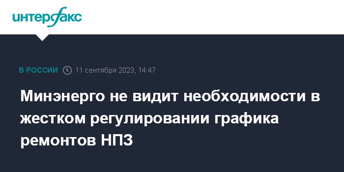 Москва. 11 сентября. INTERFAX.RU - Минэнерго не считает необходимым жестко регулировать график ремонтов нефтеперерабатывающих заводов, их владельцы вправе сами решать, когда выводить предприятия на профилактику, сказал глава ведомства Николай Шульгинов в кулуарах ВЭФ.