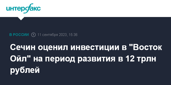 Москва. 11 сентября. INTERFAX.RU - "Инвестиции в проект "Восток Ойл", реализуемый НК "Роснефть", оцениваются в 12 трлн рублей, сообщил главный исполнительный директор "Роснефти" Игорь Сечин президенту Владимиру Путину. Они обсудили проект, пока осматривали судостроительный комплекс "Звезда", где строят танкеры, в том числе для "Восток Ойла".
