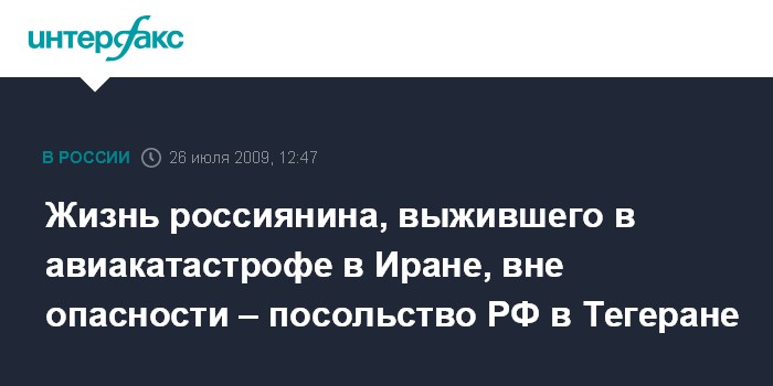 Тегеран. 26 июля. INTERFAX.RU - Жизнь россиянина, выжившего в результате авиакатастрофы Ил-62М в Иране в минувшую пятницу, вне опасности, сообщил "Интерфаксу" представитель консульской службы посольства РФ в Иране в воскресенье.