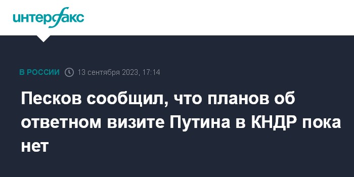 Москва. 13 сентября. INTERFAX.RU - Президент РФ Владимир Путин не планирует ответный визит в Пхеньян после приезда в Россию лидера КНДР Ким Чен Ына, сказал журналистам в среду пресс-секретарь президента РФ Дмитрий Песков.