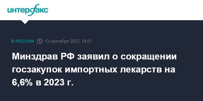 Минздрав РФ заявил о сокращении госзакупок импортных лекарств на 6,6% в 2023 г.