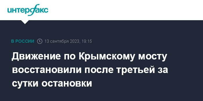 Москва. 13 сентября. INTERFAX.RU - Проезд автомобилей по Крымскому мосту возобновлен после часовой остановки в среду вечером, сообщается в телеграм-канале с официальной информацией об обстановке на подъездах к мосту.