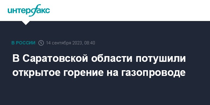 Москва. 14 сентября. INTERFAX.RU - В Саратовской области ликвидировали открытое горение вокруг газопровода d-1000 "Газпром Трансгаз Саратов", сообщил в Telegram глава областного управления обеспечения жизнедеятельности населения Юрий Юрин.