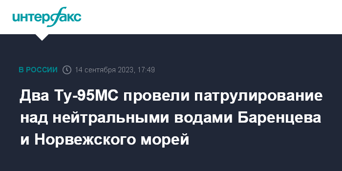 Москва. 14 сентября. INTERFAX.RU - Два российских стратегических бомбардировщика Ту-95МС в сопровождении истребителей Су-30СМ провели 4-часовое патрулирование над Баренцевым и Норвежским морями, сообщили в Минобороны РФ.
