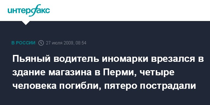 Москва. 27 июля. INTERFAX.RU - Четыре человека, в том числе 6-месячный ребенок, погибли, пятеро госпитализированы в результате ДТП в Перми.