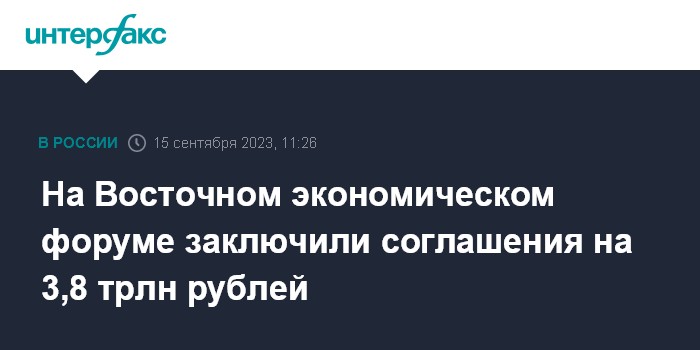 Москва. 15 сентября. INTERFAX.RU - Соглашения на общую сумму 3 трлн 818 млрд рублей подписаны на прошедшем 10-13 сентября во Владивостоке Восточном экономическом форуме (ВЭФ), сообщил вице-премьер, полпред в Дальневосточном федеральном округе Юрий Трутнев.