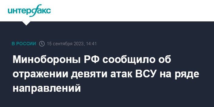 Москва. 15 сентября. INTERFAX.RU - Российские военные отразили на донецком направлении четыре атаки вооруженных сил Украины (ВСУ), по две - на запорожском и красно-лиманском, одну атаку - на южно-донецком, сообщил официальный представитель Минобороны РФ Игорь Конашенков.