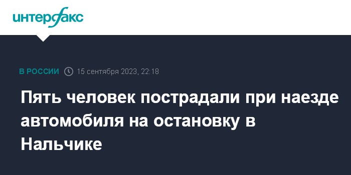 Москва. 15 сентября. INTERFAX.RU -Легковой автомобиль наехал на остановку с людьми в столице Кабардино-Балкарии Нальчике, пострадало пять человек, сообщает МВД по республике в пятницу.