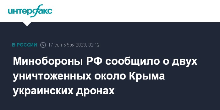Москва. 17 сентября. INTERFAX.RU - Российские военные заявили об уничтожении около 01:15 мск двух украинских беспилотников самолетного типа у побережья Крыма.