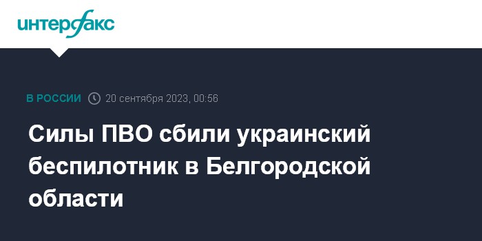 Москва. 20 сентября. INTERFAX.RU - Российские средства противовоздушной обороны (ПВО) сбили украинский беспилотник самолетного типа над Белгородской областью, заявили в Минобороны РФ.