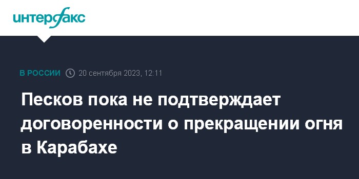 Москва. 20 сентября. INTERFAX.RU - Пресс-секретарь президента РФ Дмитрий Песков заявил, что пока не может подтвердить сообщения о договоренностях прекратить огонь в Нагорном Карабахе с 13:00 20 сентября.