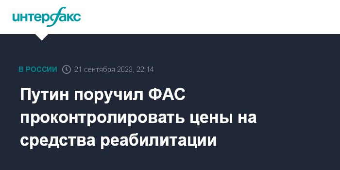 Москва. 21 сентября. INTERFAX.RU - Президент РФ Владимир Путин предложил Федеральной антимонопольной службе (ФАС) проконтролировать ценообразование на современные средства реабилитации.