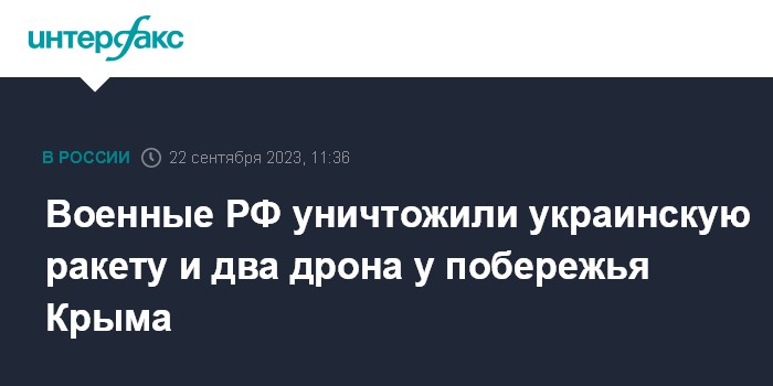 Москва. 22 сентября. INTERFAX.RU - Российские силы противовоздушной обороны (ПВО) уничтожили у побережья Крыма украинскую ракету и два беспилотника, заявили в Минобороны РФ.