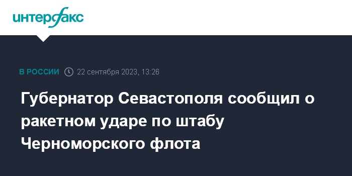 Москва. 22 сентября. INTERFAX.RU - Ракетный удар нанесен в пятницу по штабу Черноморского флота в Севастополе, сообщил губернатор города Михаил Развожаев.