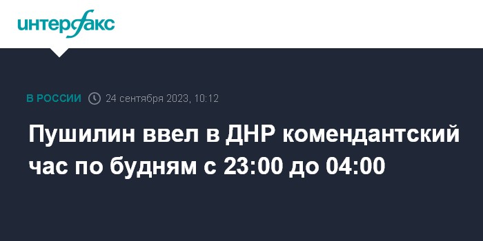 Москва. 24 сентября. INTERFAX.RU - Комендантский час по будням ввели в Донецкой народной республике, соответствующий указ подписал глава ДНР Денис Пушилин.