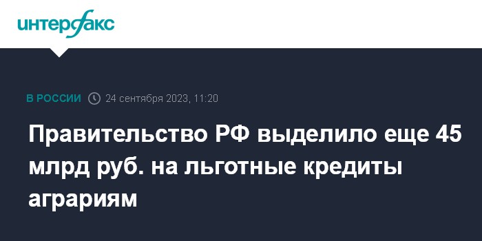 Москва. 24 сентября. INTERFAX.RU - Еще 45 млрд рублей будет дополнительно направлено на поддержку программы льготного кредитования российских сельхозпроизводителей, что позволит субсидировать более 40 тыс. займов, соответствующее распоряжение правительства подписал премьер-министр РФ Михаил Мишустин.