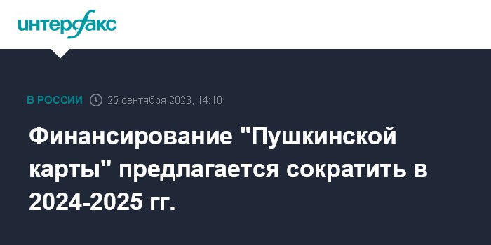 Москва. 25 сентября. INTERFAX.RU - Финансирование программы "Пушкинская карта" в 2024-2025 годах предлагается сократить в общей сложности почти на 8 млрд рублей, следует из пояснительной записки к проекту бюджета на 2024 год и плановый период 2025-2026 гг., с текстом которой ознакомился "Интерфакс".