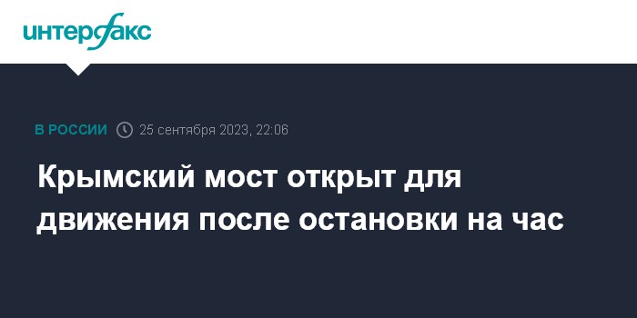 Москва. 25 сентября. INTERFAX.RU - Крымский мост в понедельник вечером открыт для проезда автотранспорта после паузы в движении примерно на час, сообщается в телеграм-канале с официальной информацией об обстановке на подъездах к мосту.
