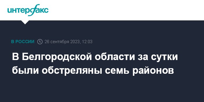 Москва. 26 сентября. INTERFAX.RU - В Белгородской области за минувшие сутки были обстреляны семь районов, сообщил в Telegram губернатор региона Вячеслав Гладков. Наибольшее число обстрелов пришлось на Шебекинский городской округ, три человека пострадали.