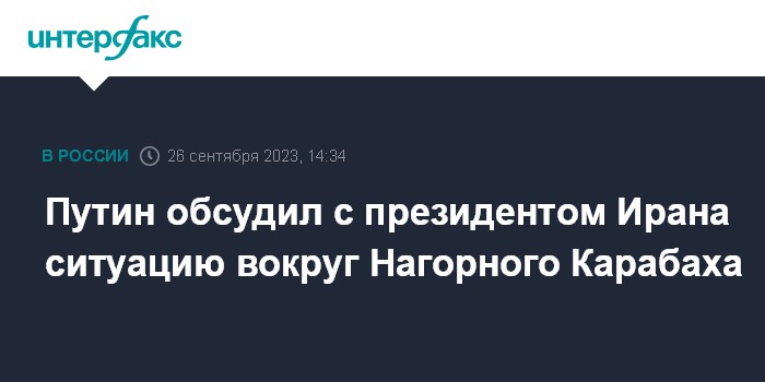 "Проведен обстоятельный обмен мнениями по ситуации вокруг Нагорного Карабаха и проблематике нормализации отношений между Азербайджаном и Арменией. Владимир Путин информировал о деятельности Российского миротворческого контингента, в том числе по оказанию гуманитарной помощи мирным жителям, защите прав и безопасности армянского населения Нагорного Карабаха. Президенты России и Ирана акцентировали важность решения всех вопросов исключительно мирными, политико-дипломатическими средствами", - говорится в сообщении пресс-службы Кремля.